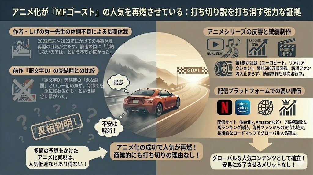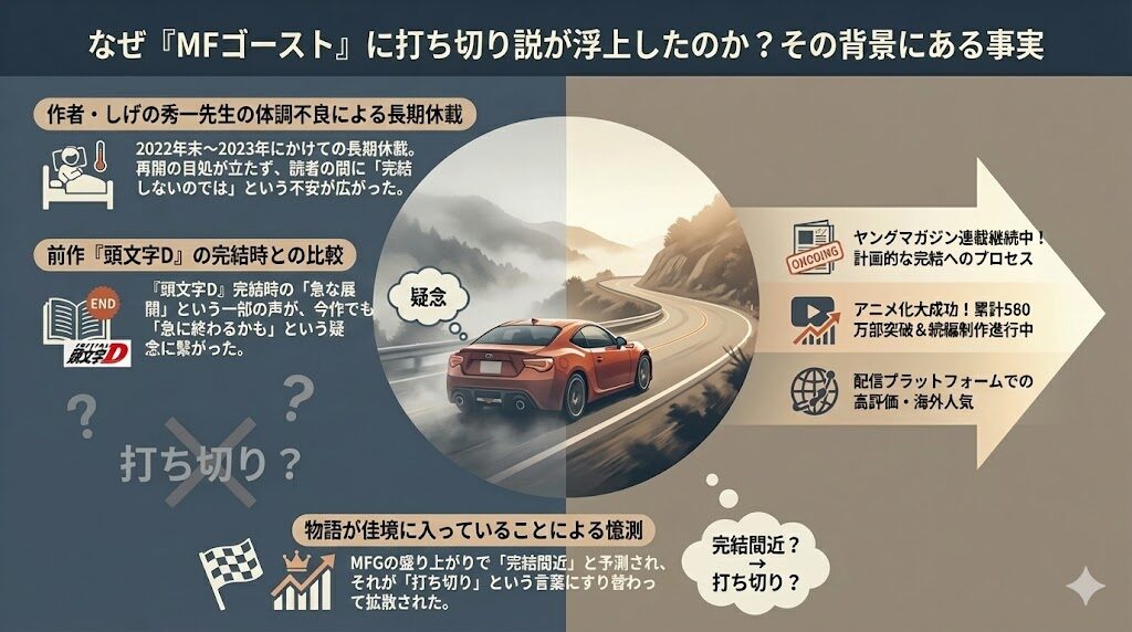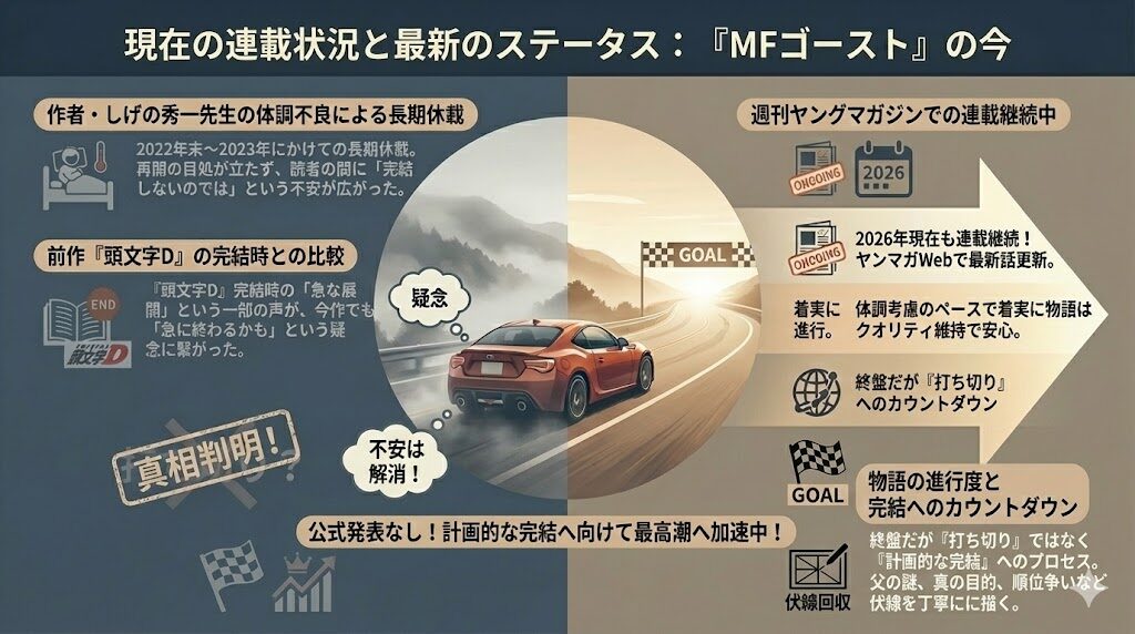 ここまで調査してきた通り、『MFゴースト』の打ち切り説は、主に過去の長期休載や作者の体調を心配するファンの声が形を変えたものでした。