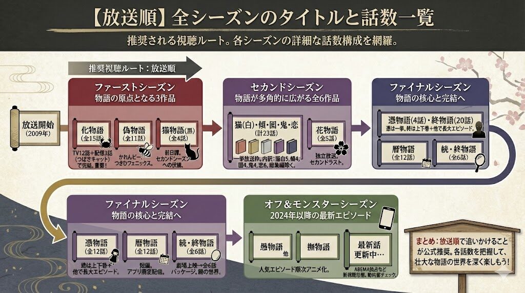 この記事では、物語シリーズを愛する運営者の視点から、各シーズンの全話数、サブタイトル、および推奨される放送順の構成を徹底的にリサーチしてまとめました。