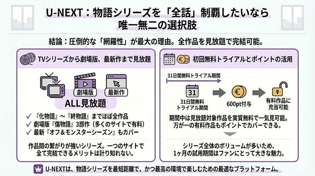 まとめ:物語シリーズの配信はU-NEXTが最強