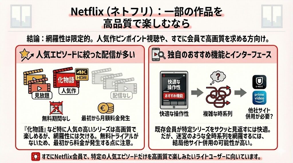 Netflix独自の高画質な視聴環境で物語シリーズの独特な演出を楽しめるのはメリットですが、シリーズを順番にすべて追いたいというニーズには不向きかもしれません。