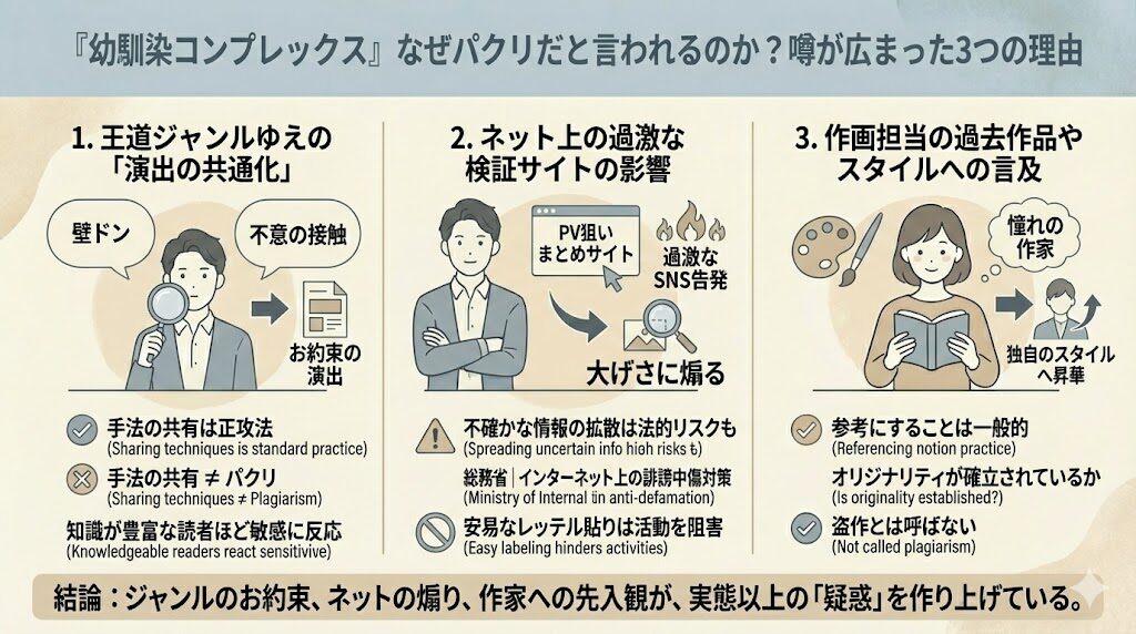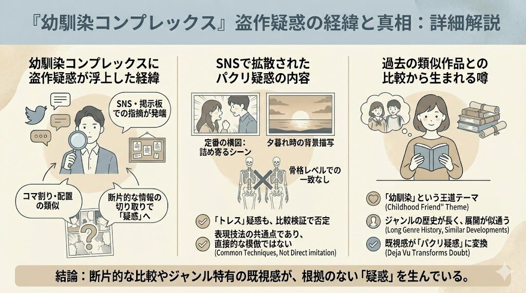 『幼馴染コンプレックス』にまつわる盗作疑惑は、調査の結果、確証のないネット上の憶測が中心であることが分かりました。